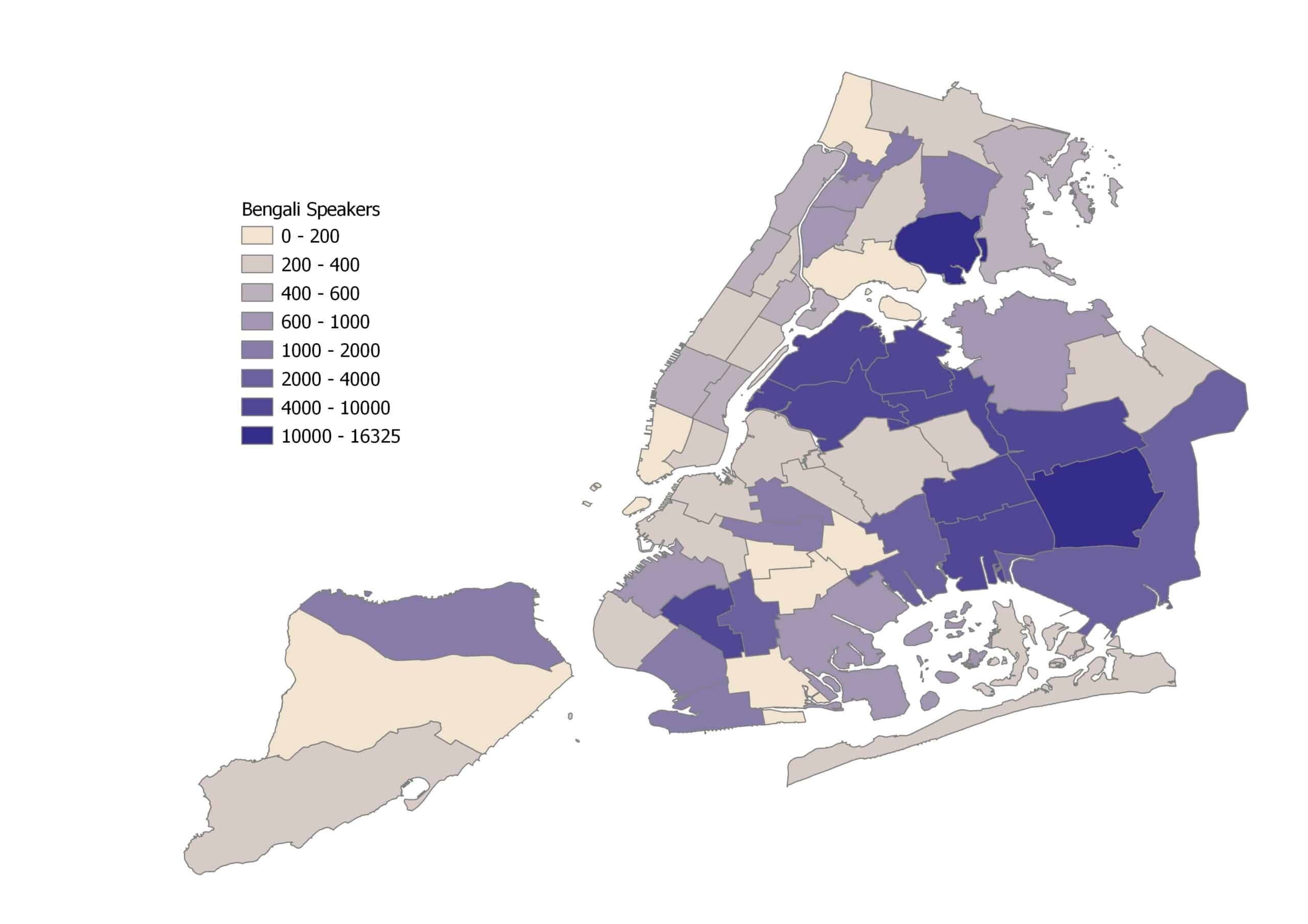 - Bengali was the second most spoken Asian language in New York City. It is widely spoken by immigrants from Bangladesh and India. Queens Community District 12 (Jamaica, Hollis & St. Albans) had the largest Bengali-speaking population, at 16,325; followed by Bronx Community District 9 (Castle Hill, Clason Point & Parkchester) with 10,301 Bengali speakers; and Queens Community District 8 (Briarwood, Fresh Meadows & Hillcrest), at 9,601 Bengali speakers.